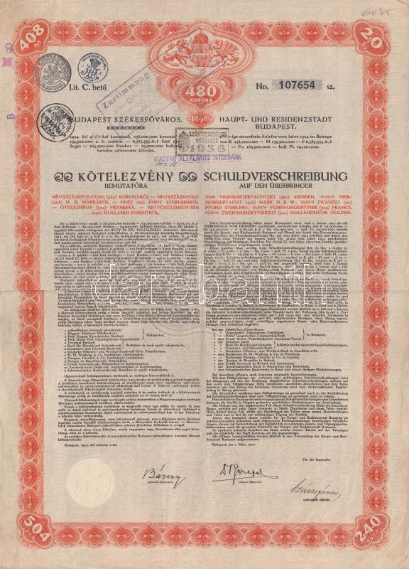 1914. Budapest Székesfőváros 4 1/2%-os Kötelezvény 480K-ról szelvények...