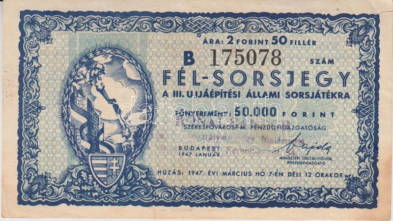 1947. "Fél-Sorsjegy a III. újjáépítési állami sorsjátékra" bélyegzett ...