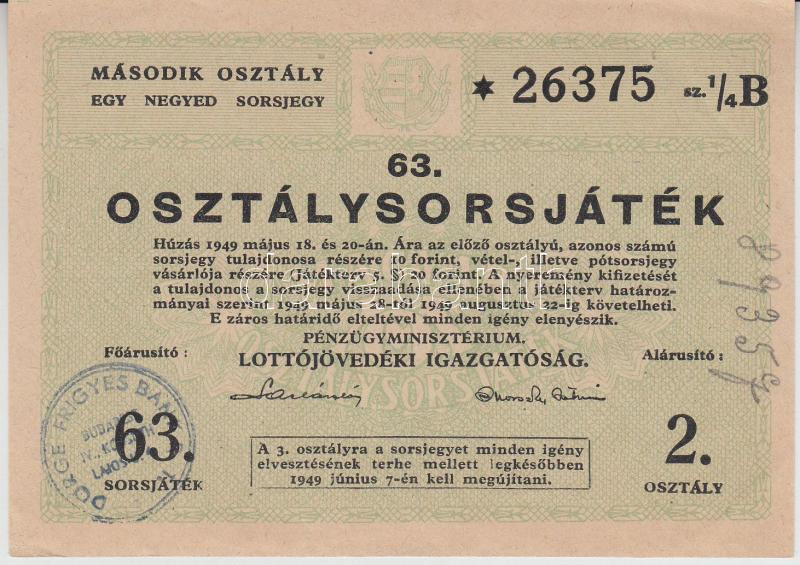 1949. "63. Magyar Osztálysorsjáték" 2. osztály 1/4 sorsjegye T:II-