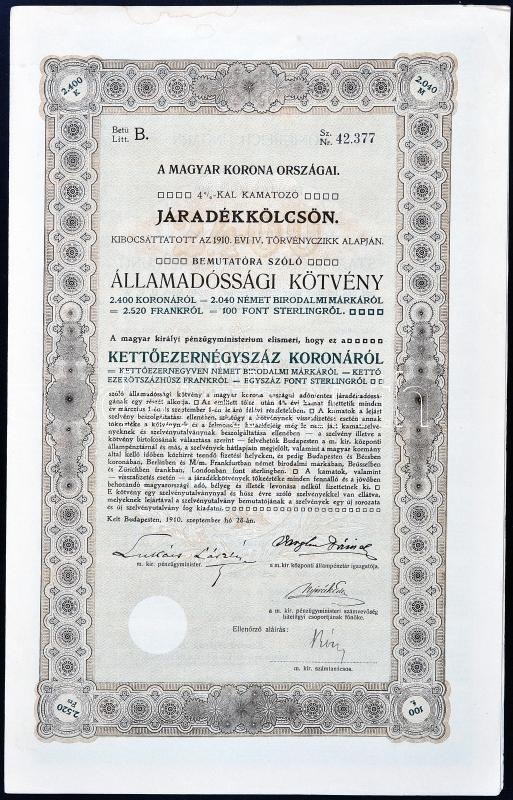 Budapest 1910. "A Magyar Korona Országai 4%-kal kamatozó Járadékkölcsö... https://www.darabanth.com/en/195-Online-auction/195.0/Numismatics/Shares-and-Tickets~400005/Budapest-1910-A-Magyar-Korona-Orszagai-425-kal-kamatozo-Jaradekkolcson--Allamadossagi-Ko~II750644