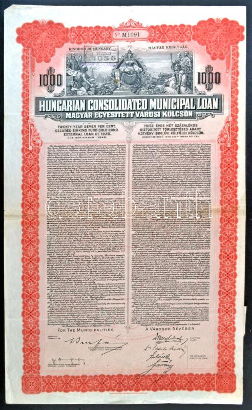 Description: Budapest 1926. "Magyar Egyesített Városi Kölcsön" 1000$ dollár névértékű 7%-kal kamatozó 20 évre szóló törlesztéses aranykötvény angol és magyar nyelven szelvényekkel, bélyegzett T:III