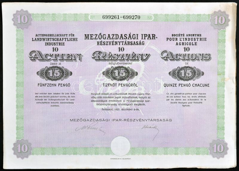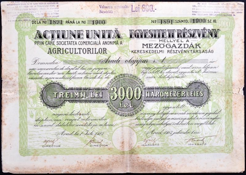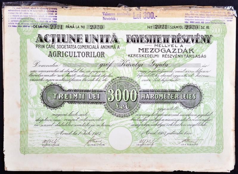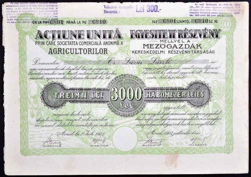 Románia / Arad 1923. "Mezőgazdák Kereskedelmi Részvénytársaság" egyesített részvénye 3000L-ről szelvényekkel (3x), egyik gr. Károlyi Gyula nevére szólóan + Budapest 1927. "Mezőgazdasági Ipar-Részvénytársaság" részvénye 15P-ről szelvényekkel + Jugoszláv Királyság / Belgrád 1933. "Rudnik Zlata Slisane Ad (Slisane aranybánya)" részvénye 100D-ról szelvényekkel, bélyegekkel T:II-III