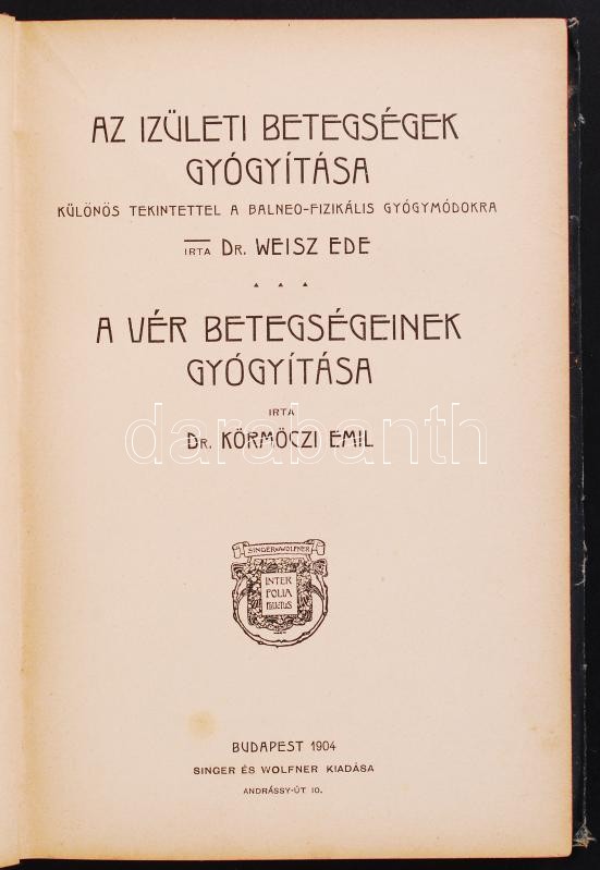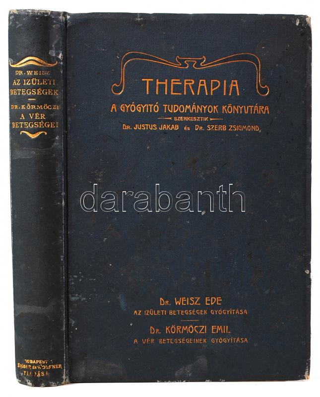 1904 Therapia. Szerk.: Dr. Justus Jakab és Dr. Szerb Zsigmond. VI.: Az izületi betegségek gyógyítása, különös tekintettel a Balneo-fizikális gyógymódokra, írta: Dr. Weisz Ede. A vér betegségeinek gyógyítása, írta: Dr. Körmöczi Emil. Budapest, 1904, Singer és Wolfner kiadása, kopottas állapotban, aranyozott egészvászon kötésben, 14x20 cm