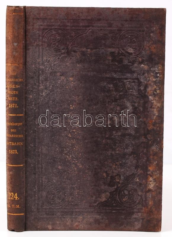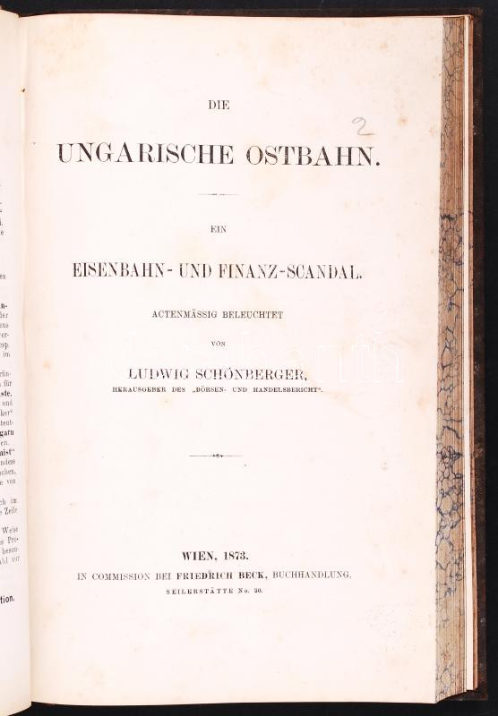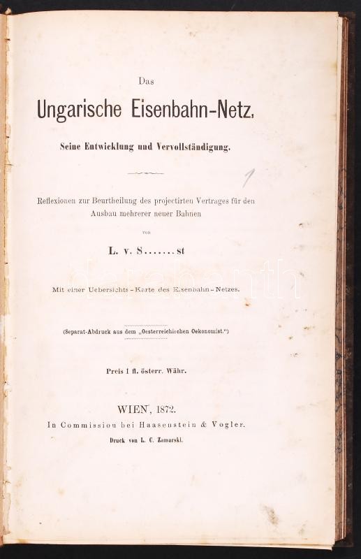 Das Ungarische Eisenbahn-Netz. Seine Entwicklung und Vervollständigung... von L. v. S...st. Wien, 1872, Haasenstein & Vogler; Ludwig Schönberger: Die ungarische Ostbahn. Ein Eisenbahn- und Finanz-Scandal. Actenmässig beleuchtet von - -. Wien, 1873, Friedrich Beck. Egybekötve, korabeli, dombornyomott egészvászon kötésben, márványozott lapszélekkel. A kötés penészes, egyébként jó állapotú