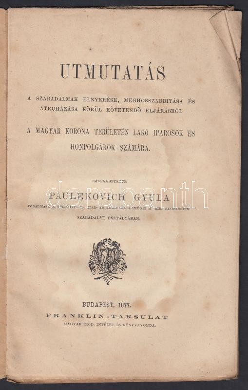 Paulekovich Gyula: Útmutatás a szabadalmak elnyerése, meghosszabítása és átruházása körül követendő eljárásról Bp., 1877. Franklin 16p. (foltos)