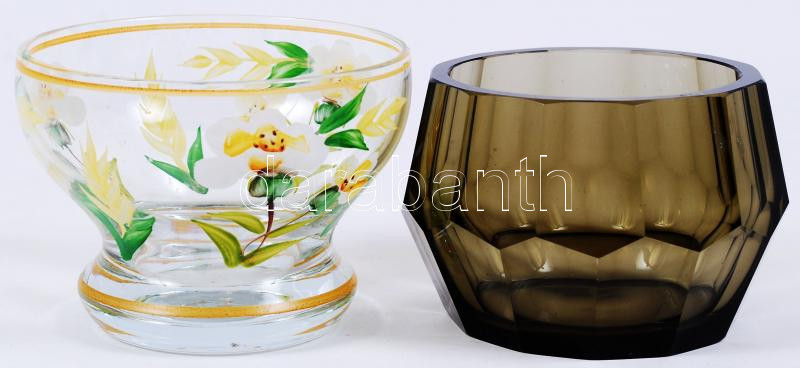 2 db hibátlan üvegtálka, egyik kézzel festett, d:10 cm, m:7 cm