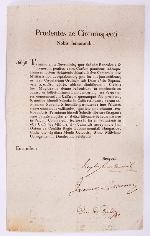 1812 Helytartótanácsi rendelet, bankjegyek kibocsátásáról és visszavonásáról, Gróf Brunszvik József országbíró, báró Barkóczy József, Latinovits János saját kezű aláírásával