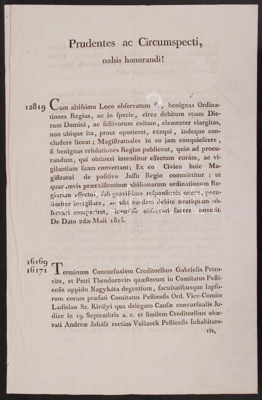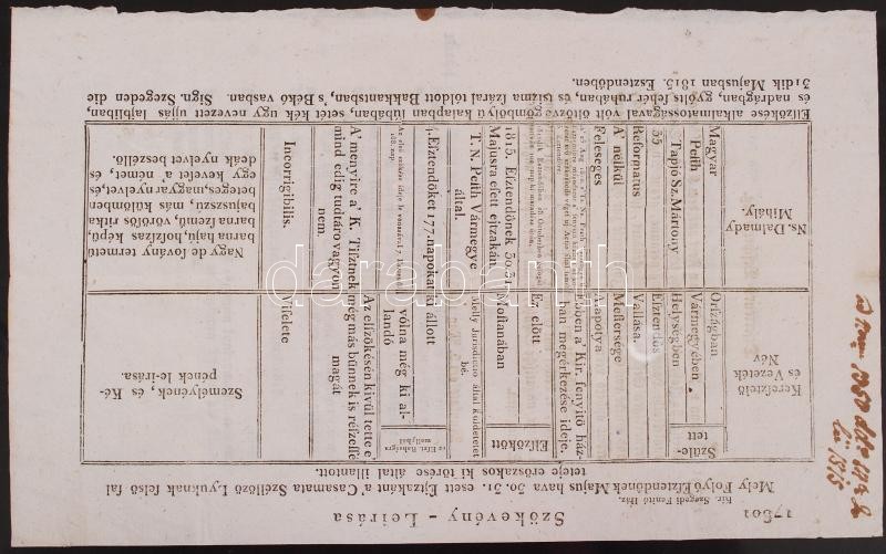1815 Helytartótanácsi leirat, szökevények leírásáról és átszállításáról szóló rendelkezések, Brunszvik József országbíró (187-1827) és Lány Sámuel aláírásával. Egy melléklet, német-magyar nyelvű, a szökevények leírásával.