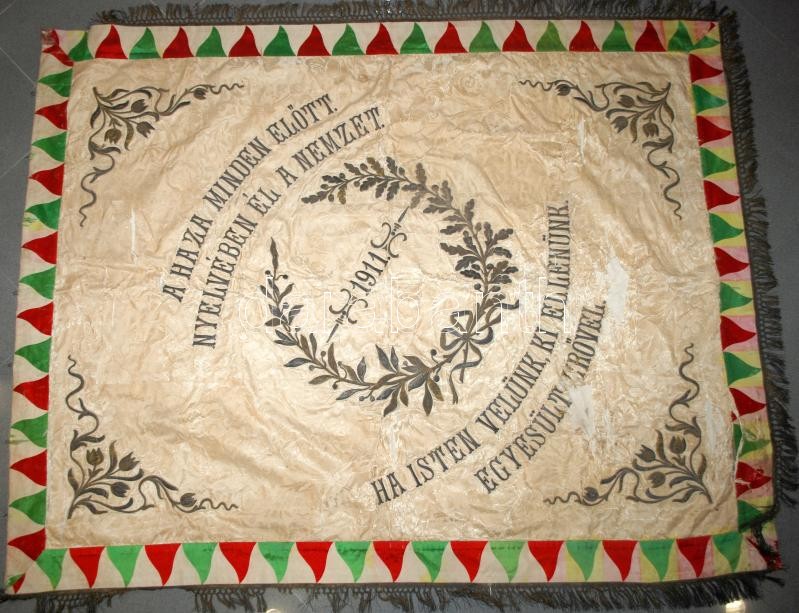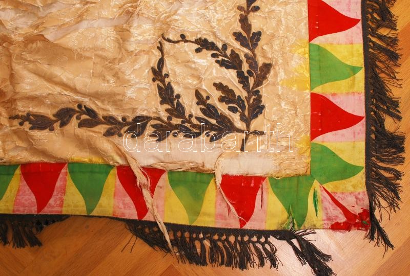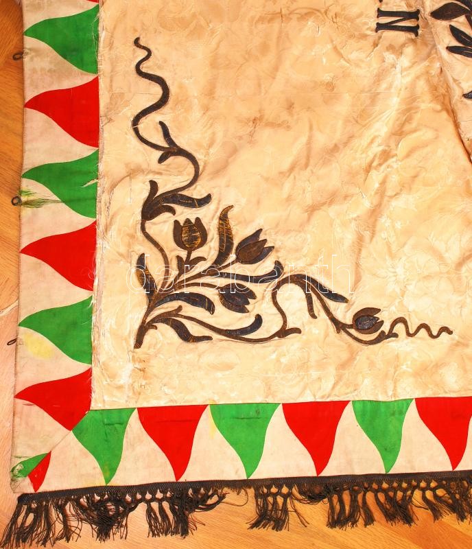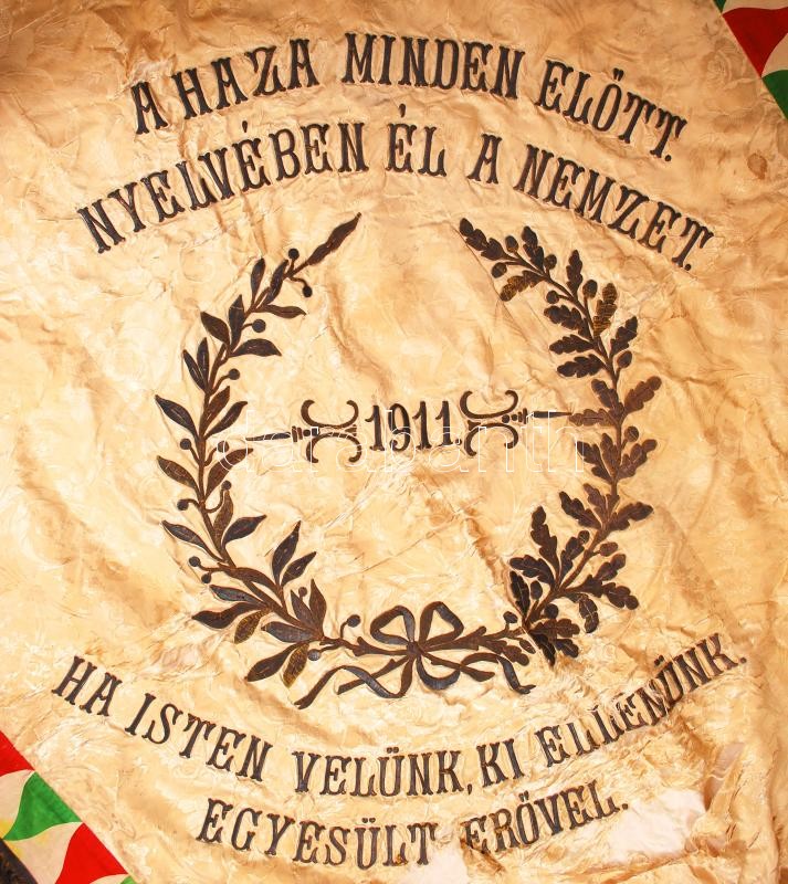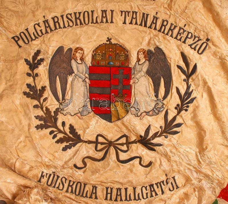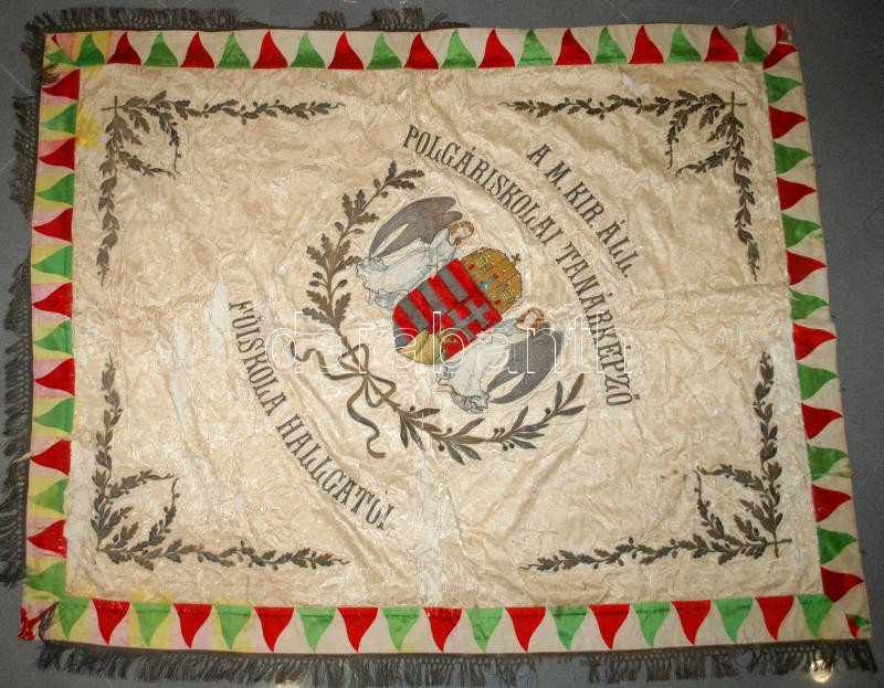1911 Nagyméretű hímzett selyem zászló: "A m. kir. áll. polgáriskolai tanárképző" felirattal és hímzett nagycímerrel, néhol kis szakadásokkal a selymen / Large silk flag 180x200 cm