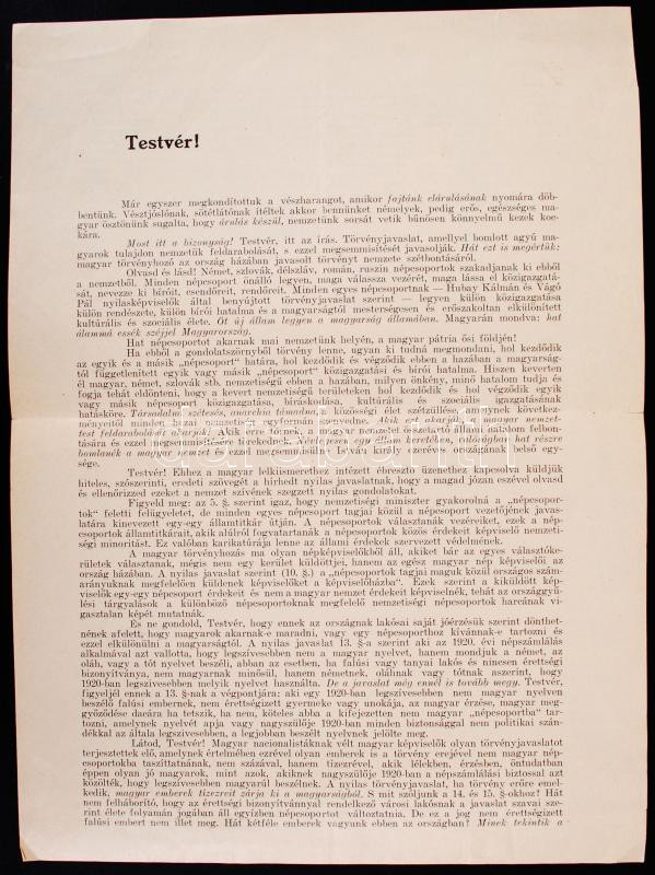 Description: 1940 A Rongyos Gárda tiltakozó röplapja a nyilasok által benyújtott nemzetiségi törvényjavaslat ellen, mely széles autonómiát adott volna a magyarországi népcsoportoknak