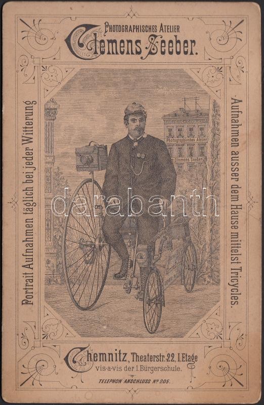 Description: cca 1900-1910 Clemens Seeber (Chemnitz) műtermének reklámgrafikája egy kabinetfotó hátoldalán: háromkerekű triciklire szerelt fényképezőgép; ritka lelet! /