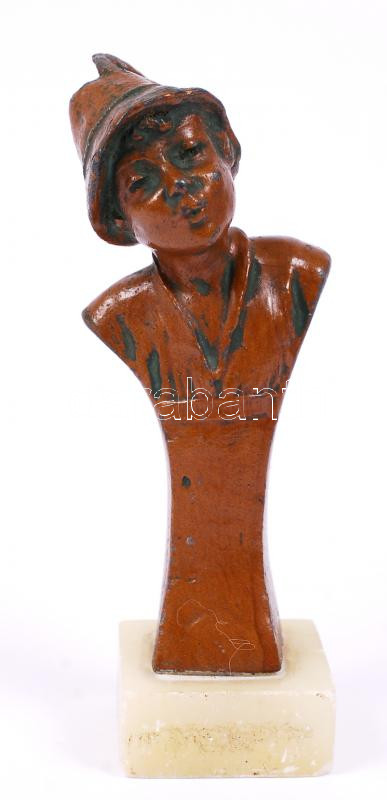 Whistling boy, art nouveau bust from painted zamak on alabaster stand (with fault), 10cm