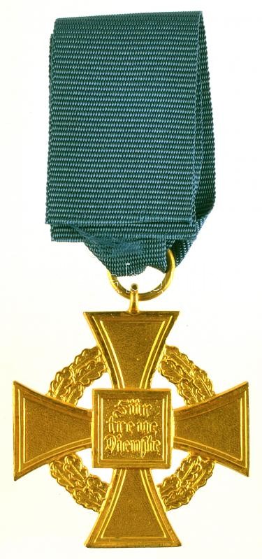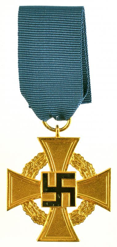 1938. "Treudienst-Ehrenzeichen, 1. Stufe für 40 Jahre (40 Year Faithful Service 1st Class Honour Award)" gold plated bronze decoration on original ribbon and in original case, with awarding document facsimile sign of Adolf Hitler! C:AU