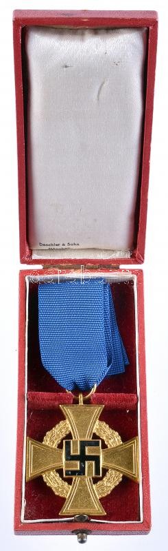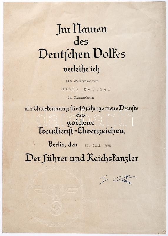 1938. "Szolgálati kitüntetés arany fokozata 40 éves szolgálat után" aranyozott bronz kitüntetés eredeti szalagon, adományozói tokkal és adományozói okirattal Adolf Hitler fakszimile aláírásával T:1-