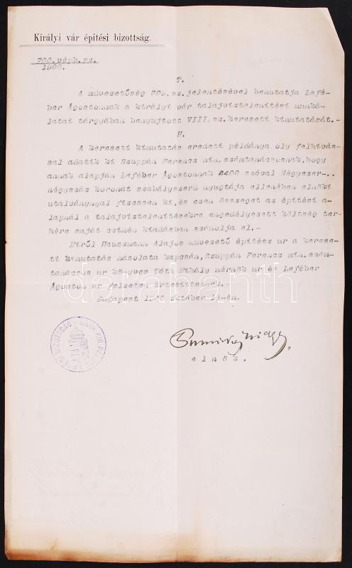 1900 báró Podmaniczky Frigyes a Királyi Vár Építési Bizottság elnöke által aláírt hivatalos levél, a vár víztelenítési munkáival kapcsolatban