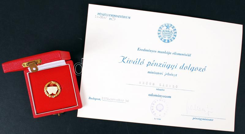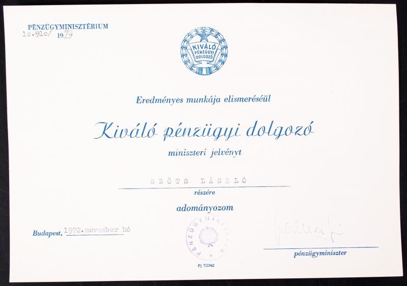 1972 Faluvégi Lajos pénzügyminiszter aláírása okmányon + Kiváló pénzügyi dolgozó jelvény