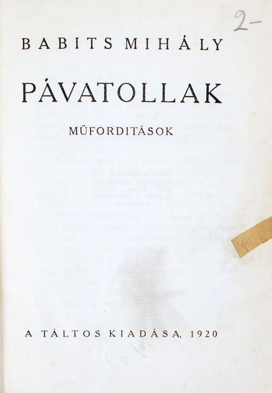 https://www.darabanth.com/en/196-Online-auction/196.0/Other-collectibles/Books-Other-rarities~400037/Babits-Mihaly-Pavatollak-Taltos-1920-Elso-kiadas-Megviselt~II754856