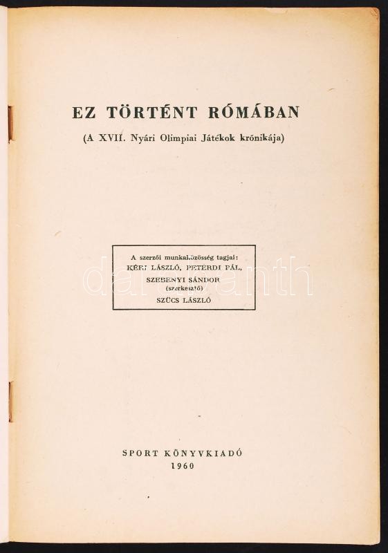 Kéri László et al.: Ez történt Rómában. A XVII. Nyári Olimpiai Játékok krónikája. S. l. (Bp.), 1960, Sport könyvkiadó. 127p. Papírkötésben.