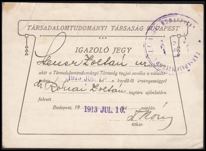 1913 A Társadalomtudományi Társaság igazoló jegye
