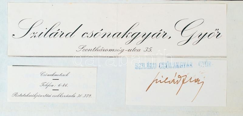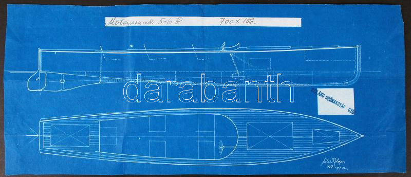1927. Motorcsónak tervrajza. A győri Szilárd Csónakgyár pecsétjével ellátva. Nyomott papír, 18.5 x 40.4 cm