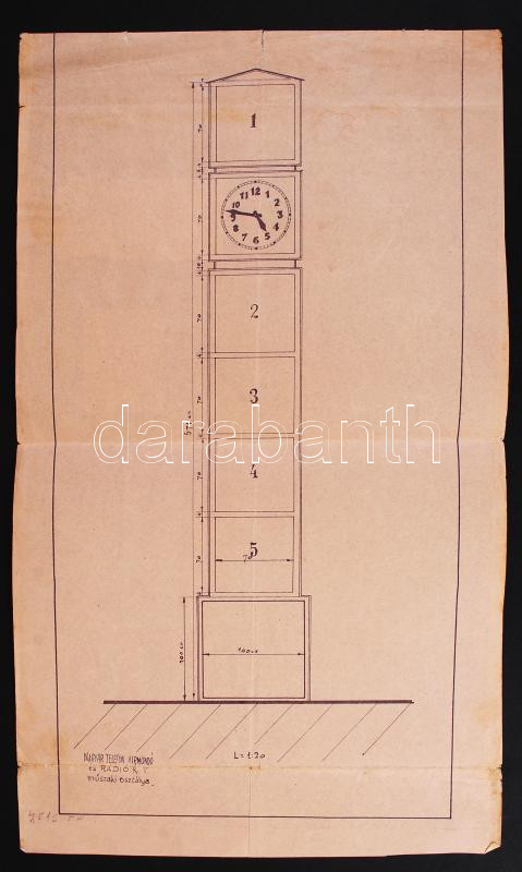 1935 Győr, hirdetőóra tervrajza, kézzel rajzolt, illetékbélyegekkel