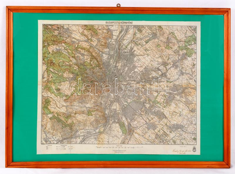 Description: cca 1930 Magyar Kir. Honvéd Térképészeti Intézet által kiadott Budapest és környéke térkép, üvegezett keretben, ami 52x72 cm, maga a térkép 43x52 cm, aláírt