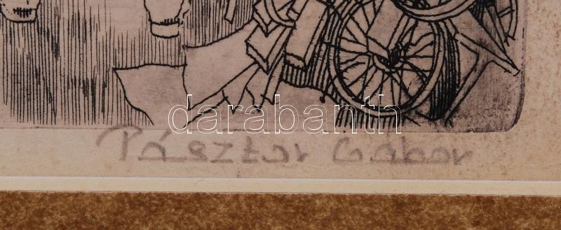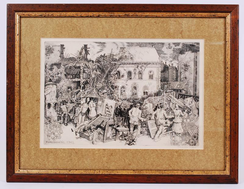Pásztor Gábor (1933-2012): Romeltakarítás. Rézkarc, papír, jelzett, üvegezett keretben, 20×29 cm