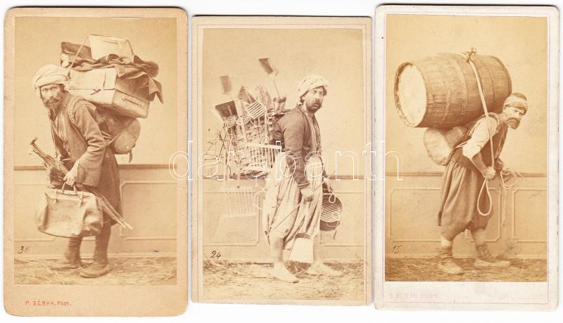 1872 Pascal Sébah (1823-1886): Török kiskereskedők, áruszállítók. 3db keményhátú fénykép, vizitkártya méretben /