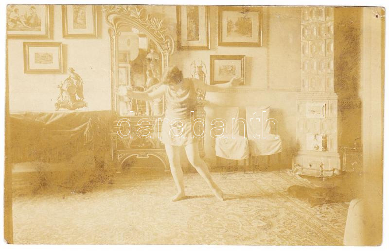 1925 Ismeretlen szerző fotója a Szentpál Olga mozgásművészeti iskola egyik növendékéről, otthoni környezetben; levlap méretben