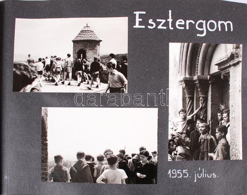 1949-1957 Osztályunk története, fotóalbum 110 fotóval: csoportképek, zászlóavatás, Esztergom, Veszprém, Ördögárok, Csesznek, Balatonfüred, Tihany, Badacsony, Tapolca, osztálynévsor, két levél és egy képeslap Vető Andristól, aki szüleivel 1957-ben Santiagóba vándorolt ki