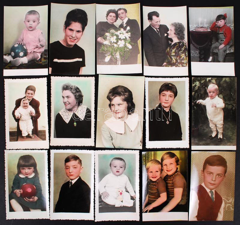 Description: 1950-1970 Demeter Sándor szentesi fényképész 99 db színezett fényképe, amelyek Szentesen és Nagymágocson készültek: gyermekfotó, portré, egészalakos, páros kép, stb., levlap méretben