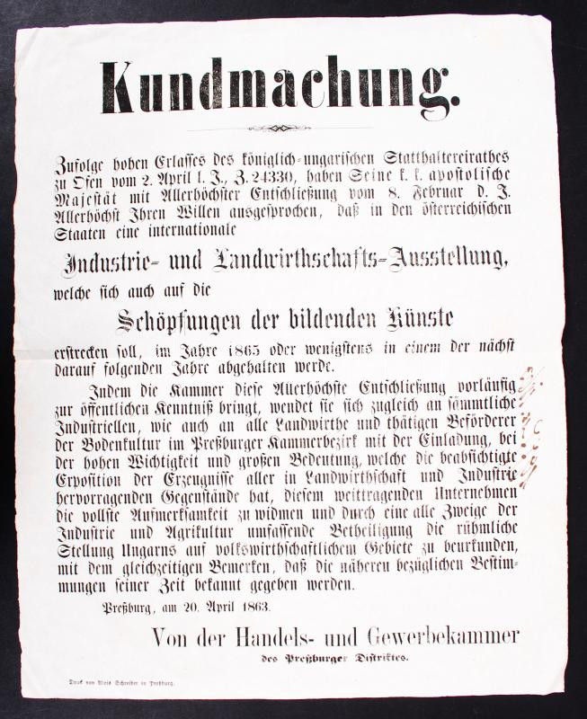 1863 Pozsonyi Kereskedelmi és Iparkamara: felhívás kiállítási tárgyakk... https://www.darabanth.com/en/196-Online-auction/196.0/Other-collectibles/Printed-Materials~400026/1863-Pozsonyi-Kereskedelmi-es-Iparkamara-felhivas-kiallitasi-targyakkal-kapcsolatban-az-1865~II753960