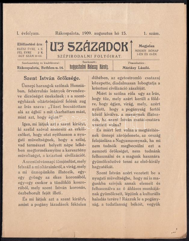 1909 Az Uj Századok című folyóirat előfizetési felhívása, hajtogatott,...
