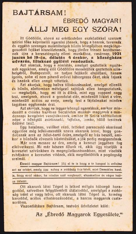 1921 Ébredő Magyarok Egyesülete a szíriai tőkések elleni tüntetésre hívó röplap