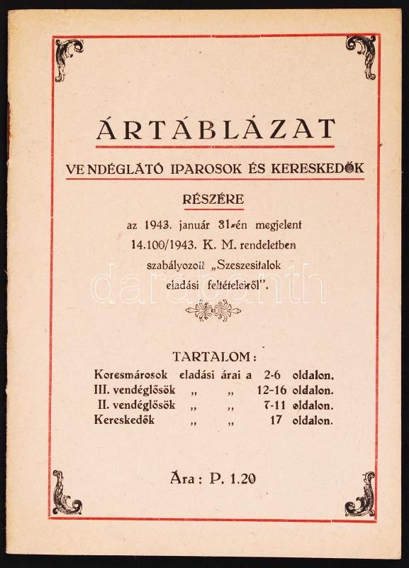 1943 Ártáblázat vendéglátó iparosok és kereskedők részére - Szeszesitalok 20p.