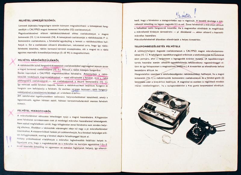 cca 1970 Calypso M8 hordozható orsós magnó használati útmutatója, tollas és ceruzás beírásokkal