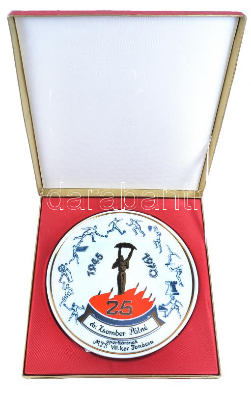 1970. A Magyar Testnevelési és Sportszövetség 25 éves felszabadulási jubileumi Hollóházi porcelán plakettje (180mm) T:1 Dísztokban adományozói irattal