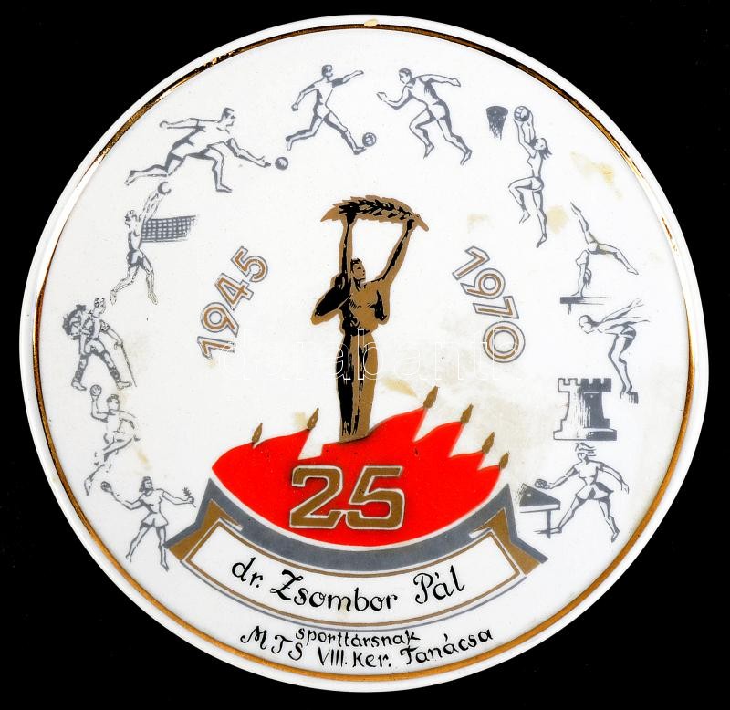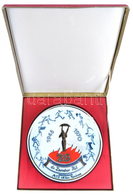 Description: 1970. A Magyar Testnevelési és Sportszövetség 25 éves felszabadulási jubileumi Hollóházi porcelán plakettje (180mm) T:1- fo. Dísztokban adományozói irattal