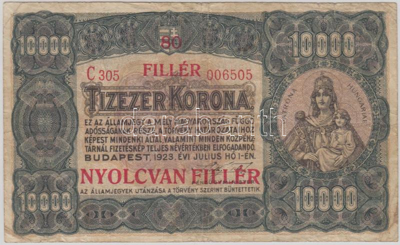 1923. 10.000K T.W nyomdahely jelöléssel "80 FILLÉR NYOLCVAN FILLÉR" felülbélyegzéssel T:III