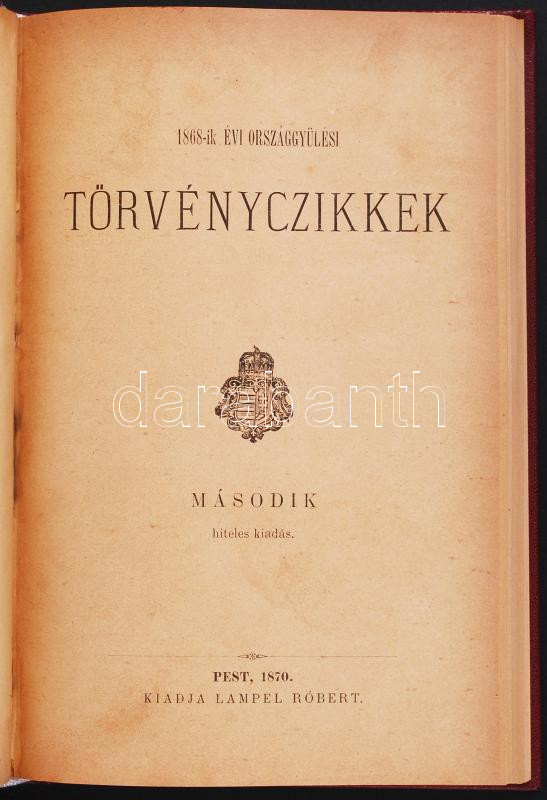 1865/67 évi törvénycikkek + Az 1868 évi törvénycikkek Bp., 1870-1894 L... https://www.darabanth.com/en/197-Online-auction/197.0/Other-collectibles/Books-History~600028/186567-evi-torvenycikkek-plus-Az-1868-evi-torvenycikkek-Bp-1870-1894-Lampel-Benne-a-kiegyeze~II760841