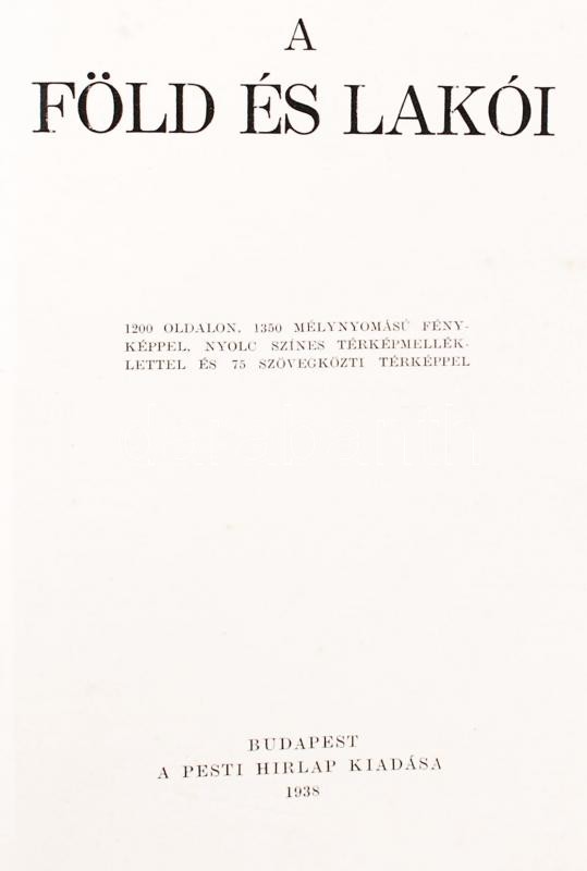 Description: A Pesti Hírlap Könyvtára: A Föld és lakói. Bp., 1938, A Pesti Hírlap Kiadása. Aranyozott, egészvászon kötésben (a gerincen kissé kopott az aranyozás, egyébként jó állapotban). 1350 mélynyomású fényképpel, 8 színes térképmelléklettel, 75 szövegközti térképpel, táblázatokkal illusztrálva.