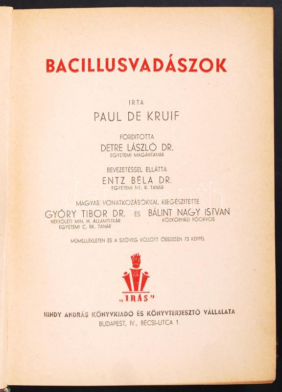 De Kruif: Bacillus vadászok, Ford.: Detre László. Bev.: Entz Béla. Magyar vonatkozásokkal kiegészitette: Győry Tibor, Bálint Nagy István. Bp., 1933, Gutenberg, Félvászon kötésben