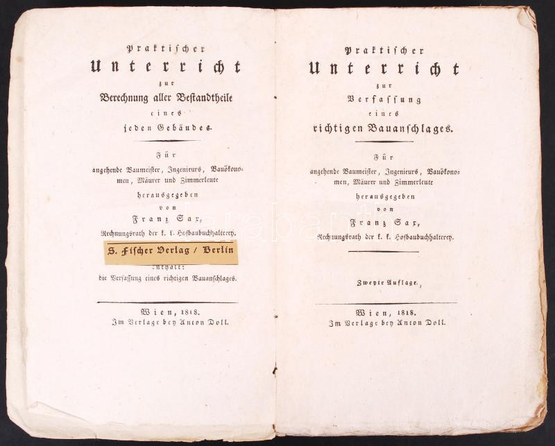 Franz Gar: Praktischer Unterricht zur verfassung eines richtigen Bauanschlages Wien, 1818. Anton Doll. Fűzve, papírborítóval 290p.