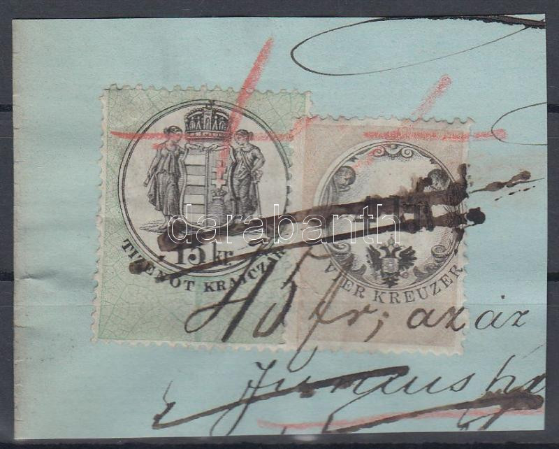 Okmánydarab 2 különböző kiadásból származó 4kr + 15kr okmánybélyeggel