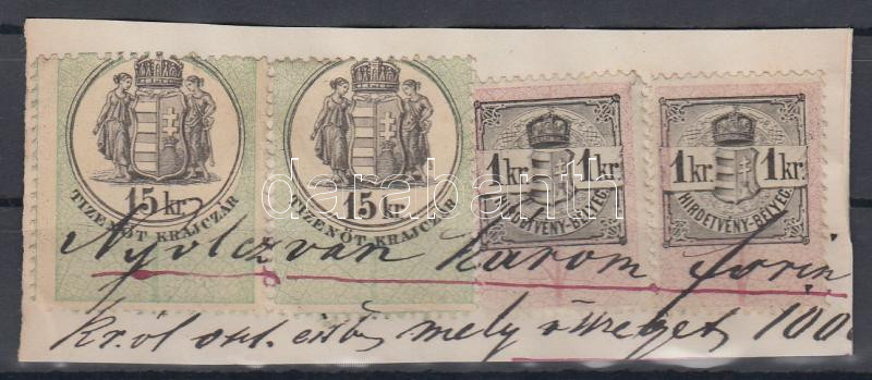Okmánydarab 2 x 15kr okmánybélyeggel + 2 x 1kr Hirdetménybélyeggel