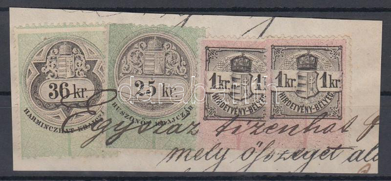 Okmánydarab 25kr + 36kr okmánybélyeggel + 2 x 1kr Hirdetménybélyeggel