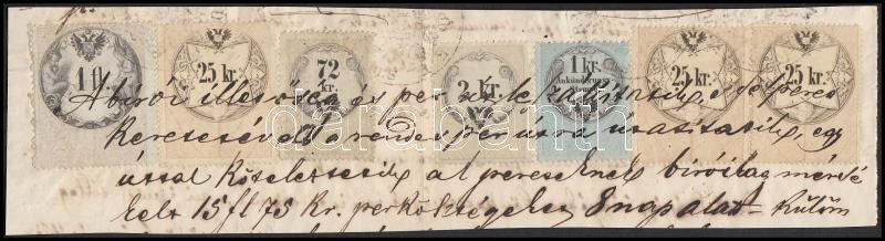 Okmánydarab 2kr + 3 x 25kr + 72kr + 1fl okmánybélyeggel + 1kr Hirdetménybélyeggel