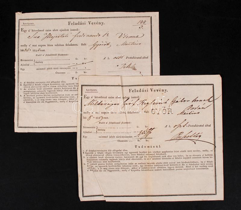 1849 Feladási vevény gróf Keglevich Gábornak, illetve "Sua Majestati" (Őfelsége) Ferdinándnak Bécsbe (2 db).