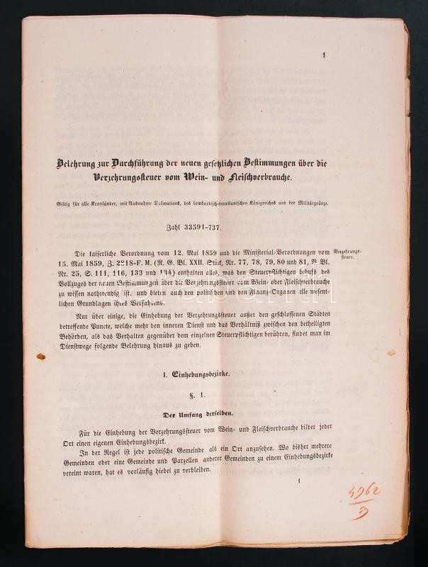 1859 Német nyelvű előírás bor- és húsfogyasztási adókról, 16 lap.