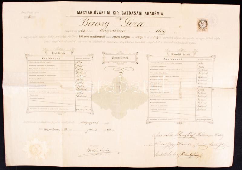 https://www.darabanth.com/en/197-Online-auction/197.0/Other-collectibles/Documents~600016/1885-A-Magyarovari-Gazdasagi-Akademia-vegbizonyitvanya-javitott~II762777